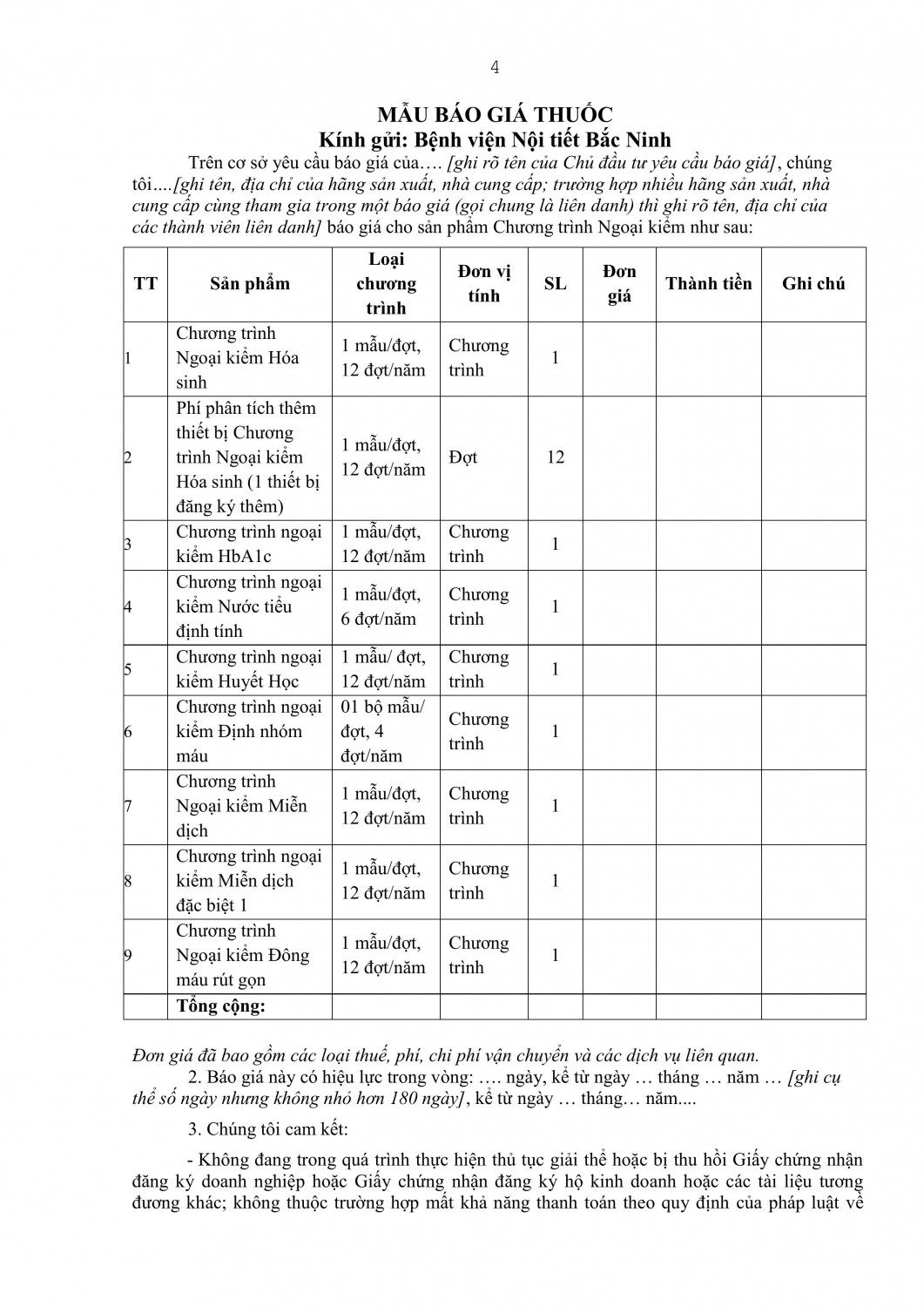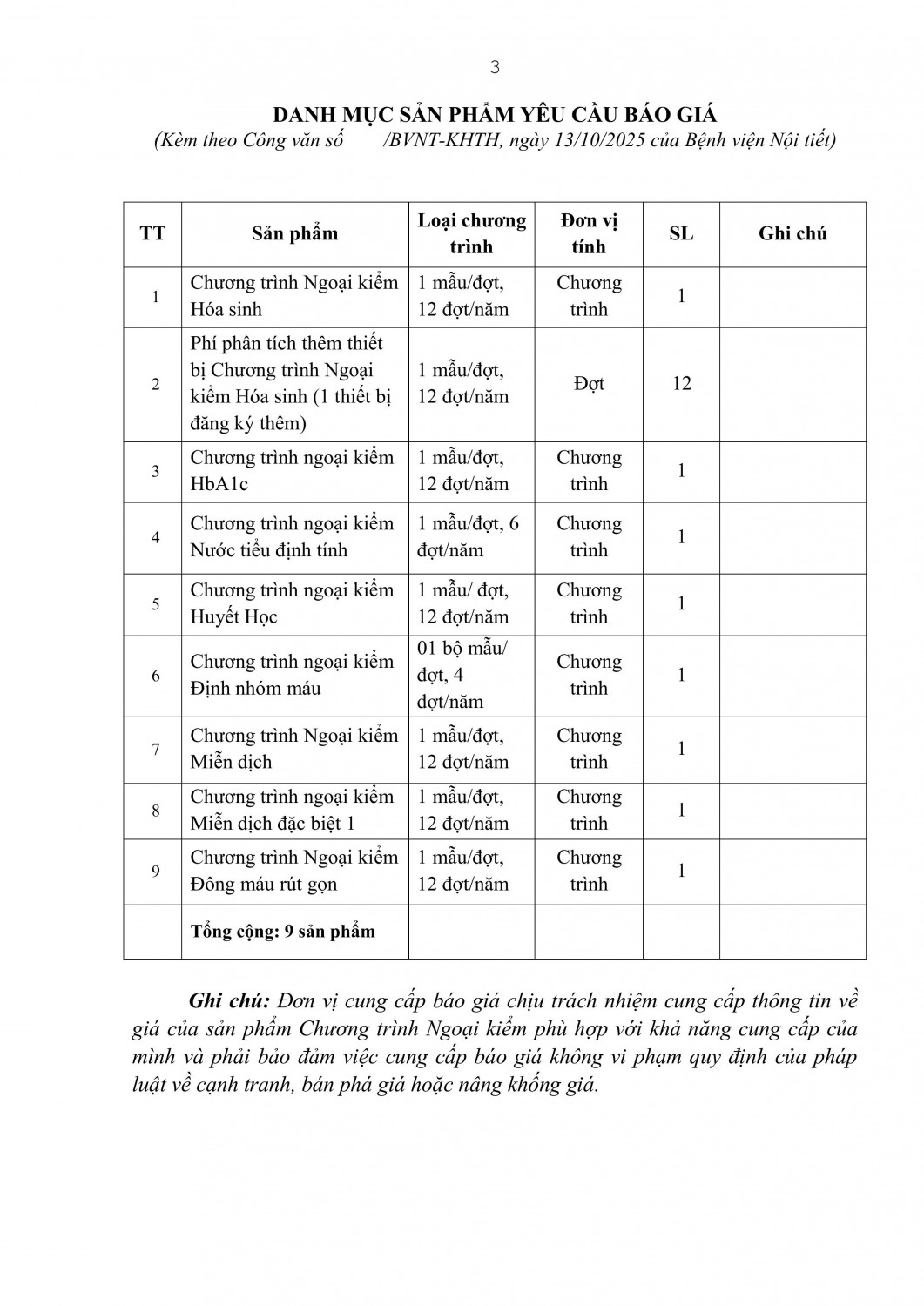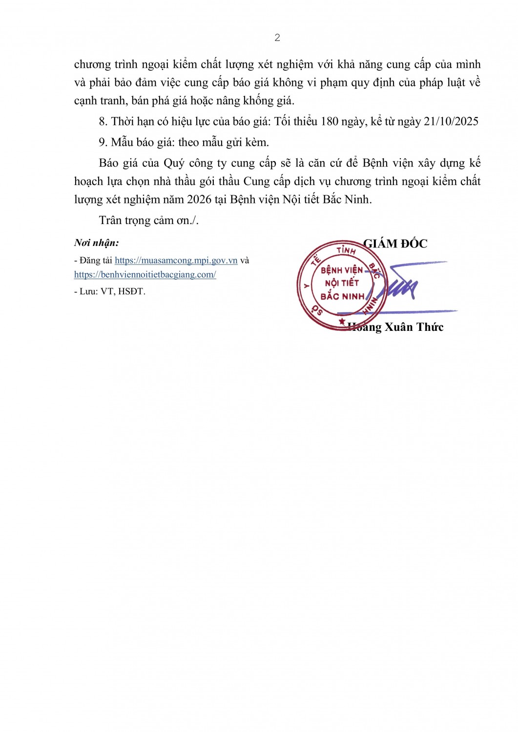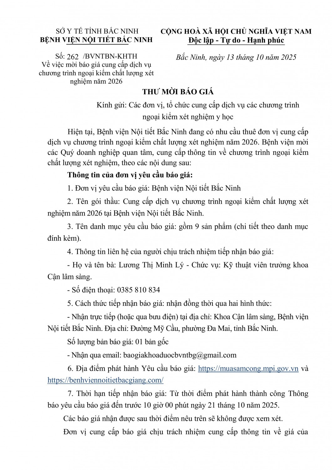 Hiện tại, Bệnh viện Nội tiết Bắc Ninh đang có nhu cầu thuê đơn vị cung cấp dịch vụ chương trình ngoại kiểm chất lượng xét nghiệm năm 2026. Bệnh viện mời các Quý doanh nghiệp quan tâm, cung cấp thông tin về chương trình ngoại kiểm chất lượng xét nghiệm, theo các nội dung sau